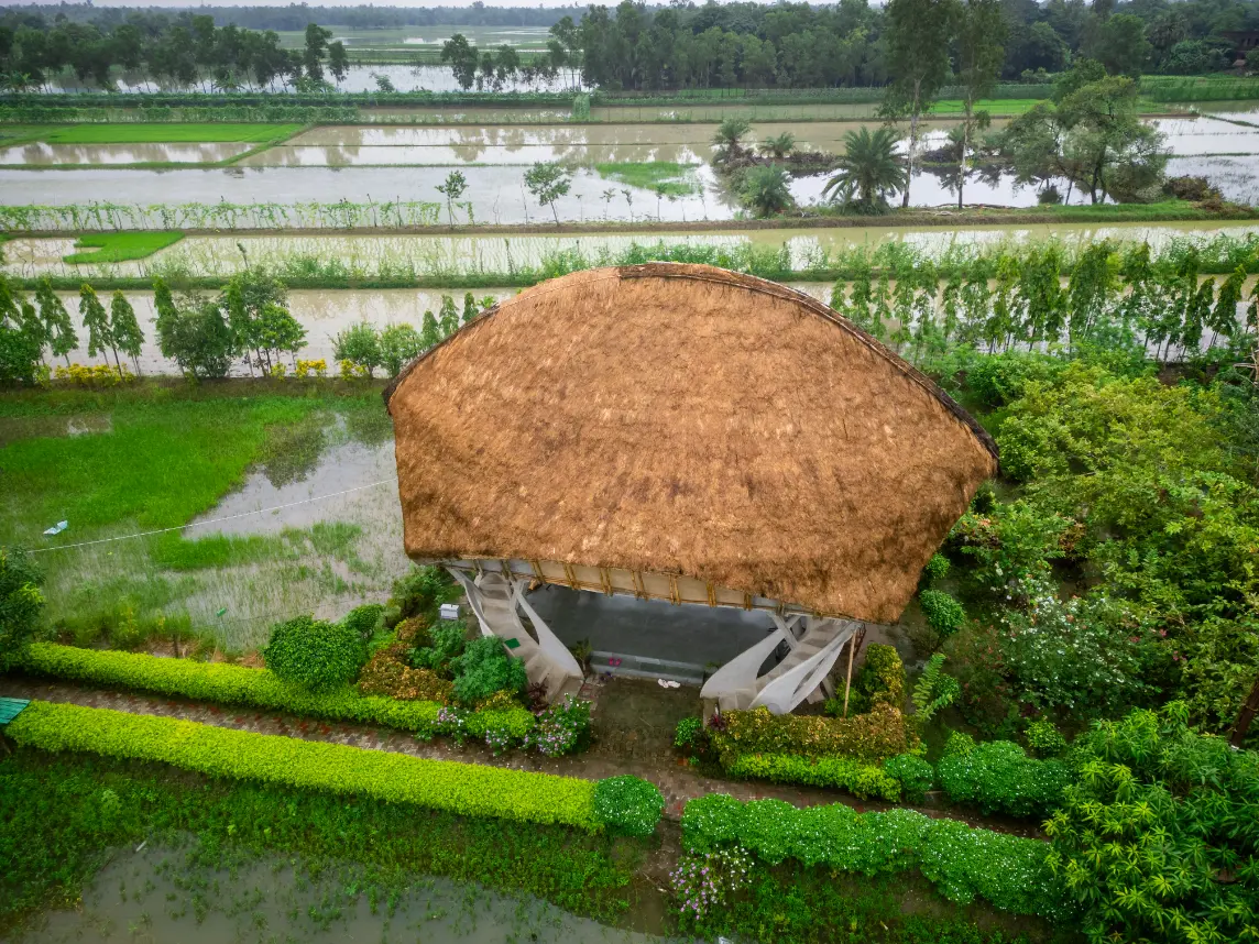 The project references traditional Bengali hut architecture through its elevated floor, verandah, pitched roof, woven ceilings, and simple spatial planning.