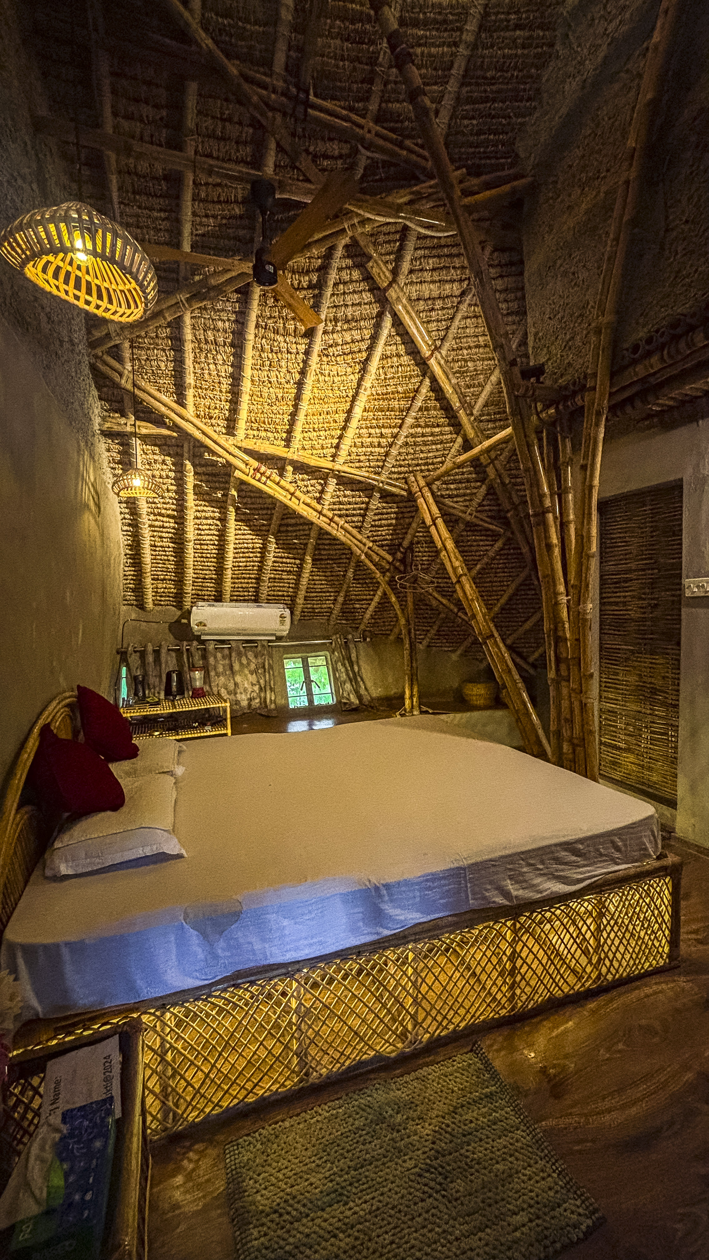 Step inside, and the interiors continue the same philosophy of restraint and authenticity. There is no excess, no decorative clutter—only warmth, craft, and comfort. Natural timber flooring, woven bamboo ceiling panels, exposed rafters, and handcrafted furniture create an atmosphere that feels intimate and restorative. The rooms are equipped with essential comforts including queen-sized beds, side tables, shelving, lighting, and ceiling fans—enough to ensure convenience without disconnecting guests from the simplicity of the place.
