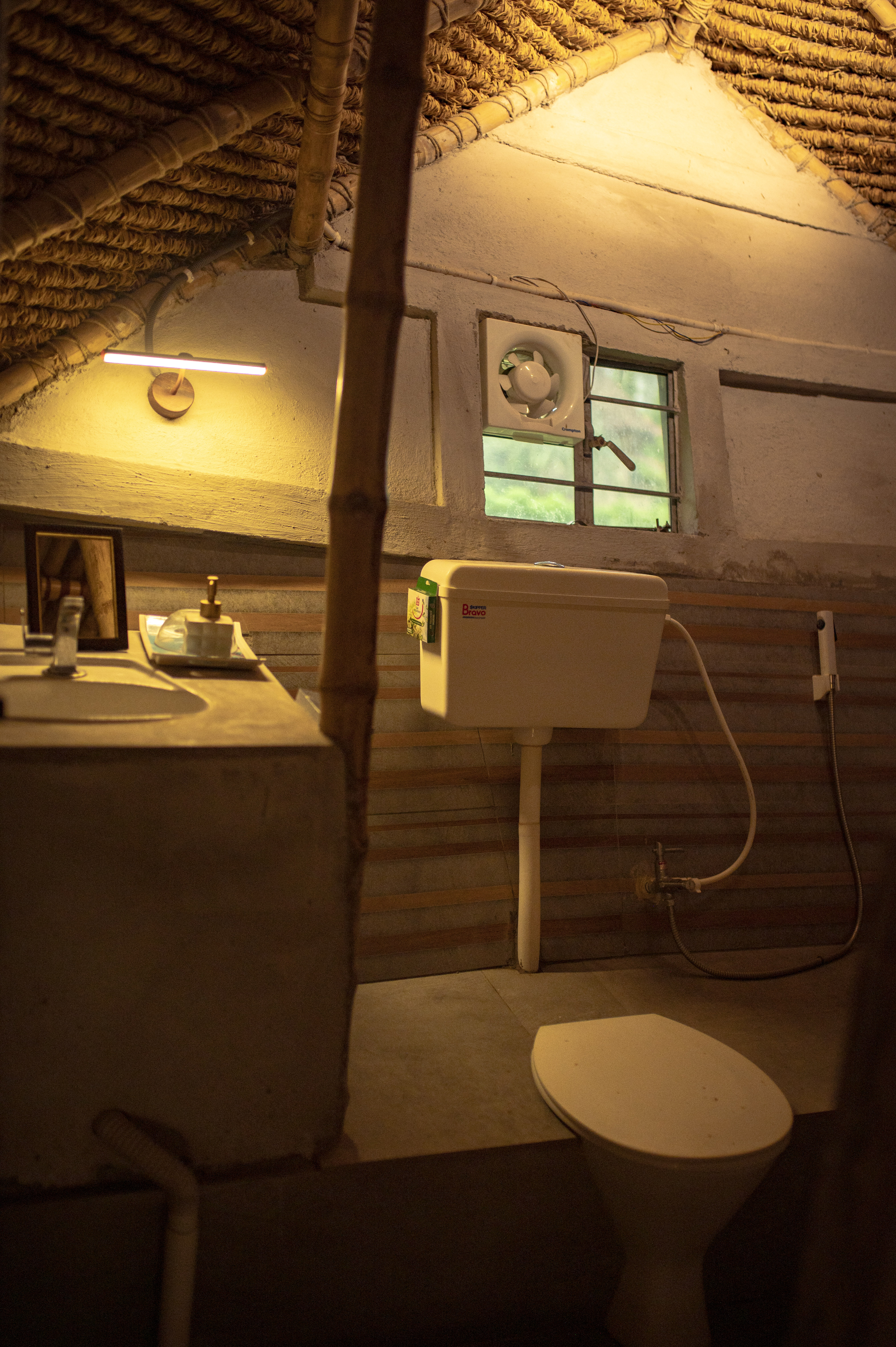 Small windows ensure ventilation, while attached bathrooms add practical comfort for guests seeking an eco-conscious stay.