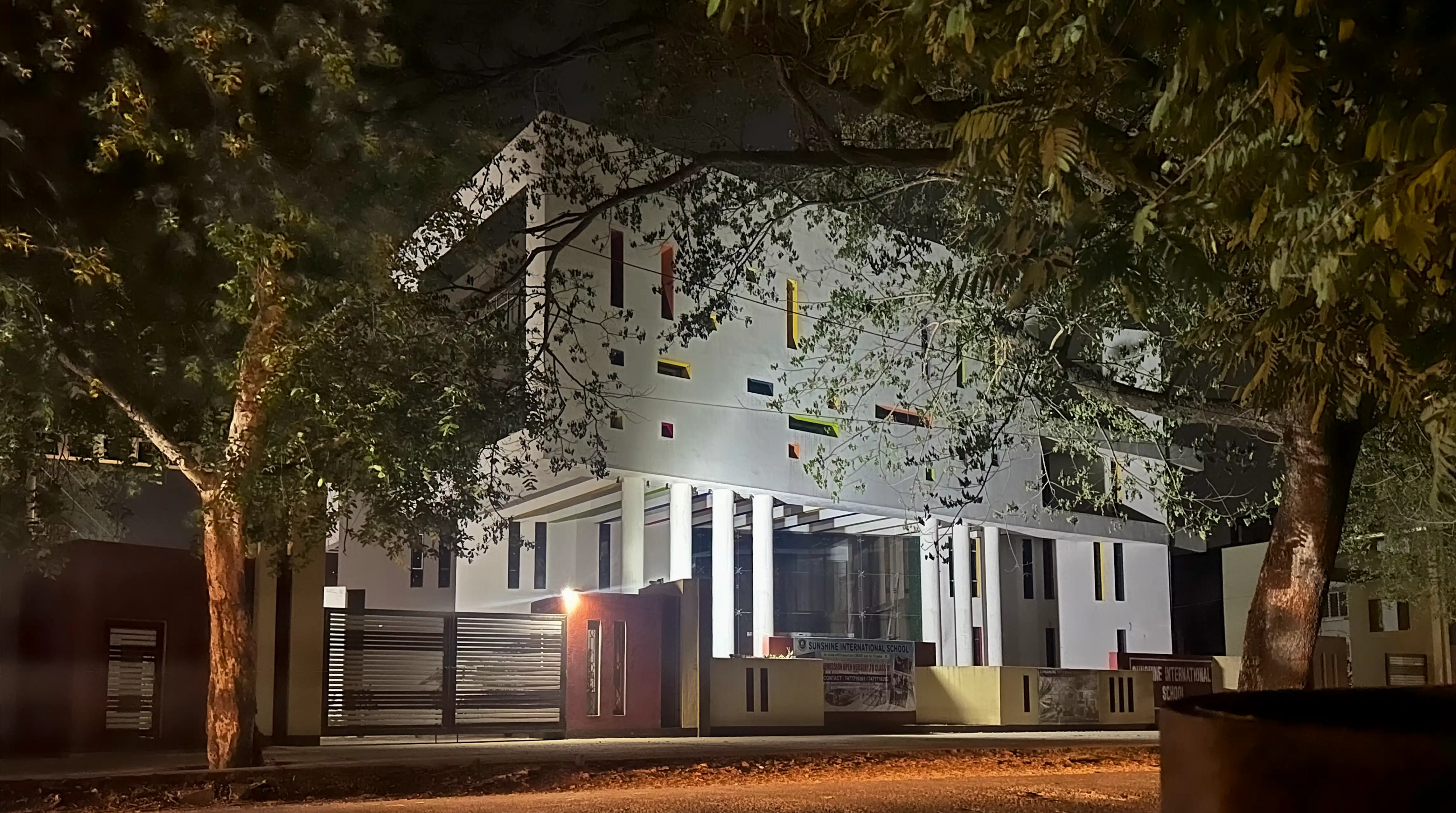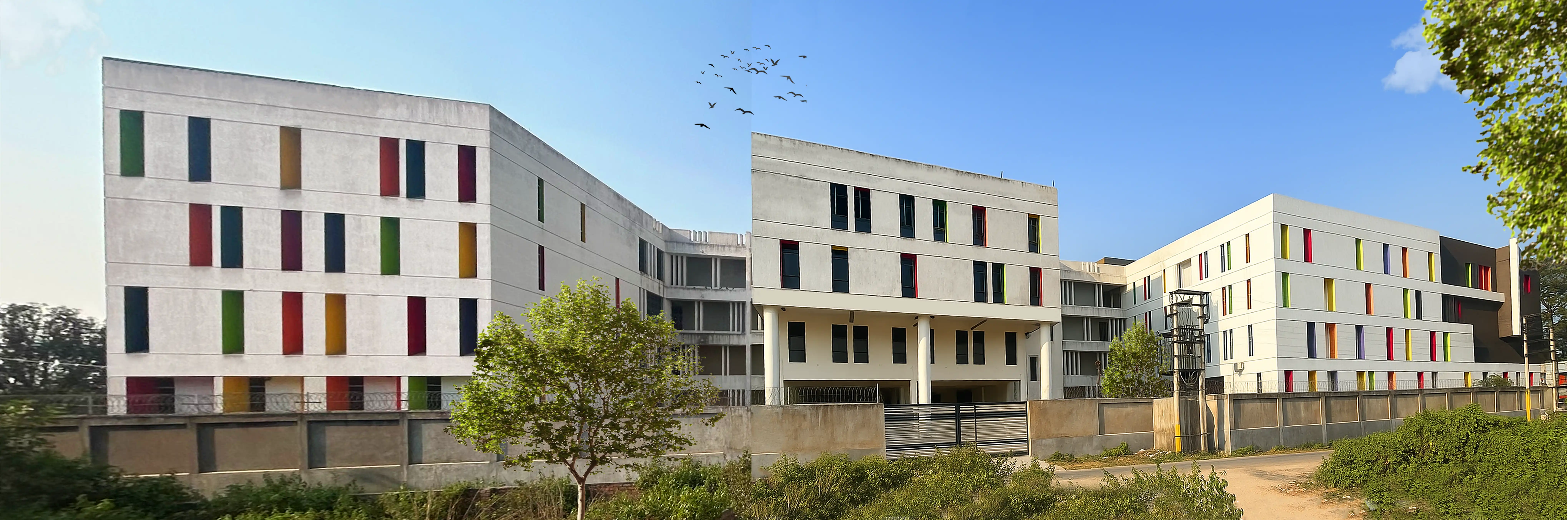 True to its name, Sunshine International School uses the seven colours of the spectrum as a core design element. These colours are not merely decorative—they symbolise creativity, diversity, and harmony. The façade features recessed vertical windows highlighted in different hues, creating a striking colourful school facade design in India. (1).webp)