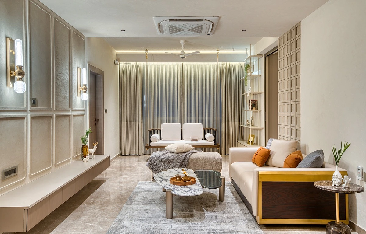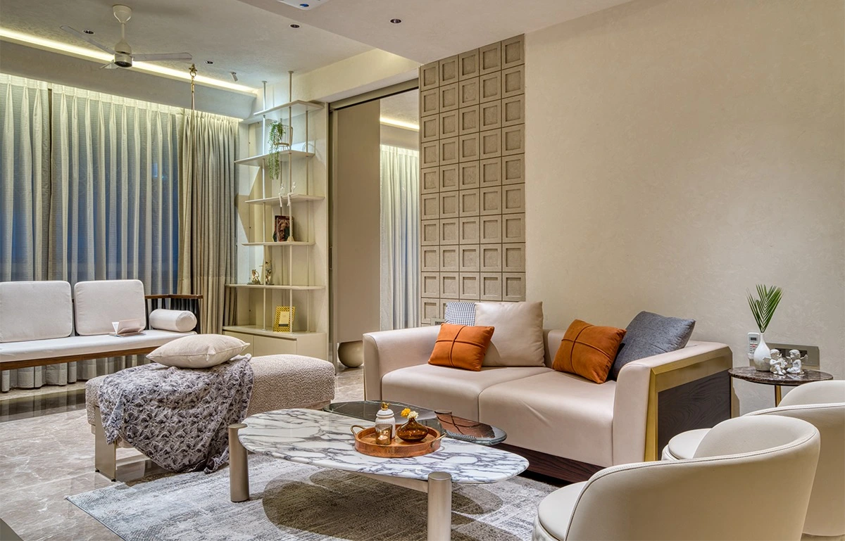 To avoid monotony, the designer introduces selective contrast through furniture and accessories. Poufs, side tables, cushions, and upholstered seating add personality in measured doses.