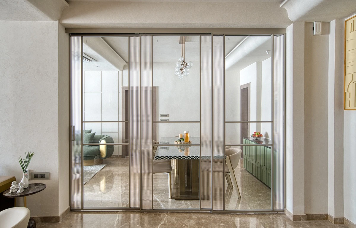 The two zones are divided by a sliding glass partition that is both elegant and highly functional. An opaque wall would have visually shortened the room and fragmented the interior. Instead, the transparent divider preserves openness while allowing privacy when required.