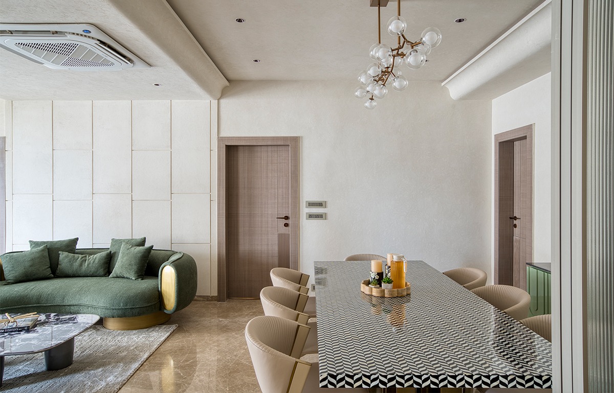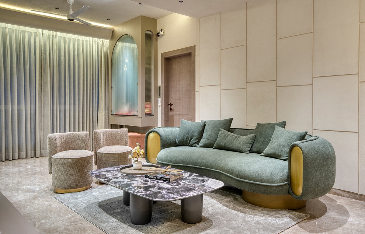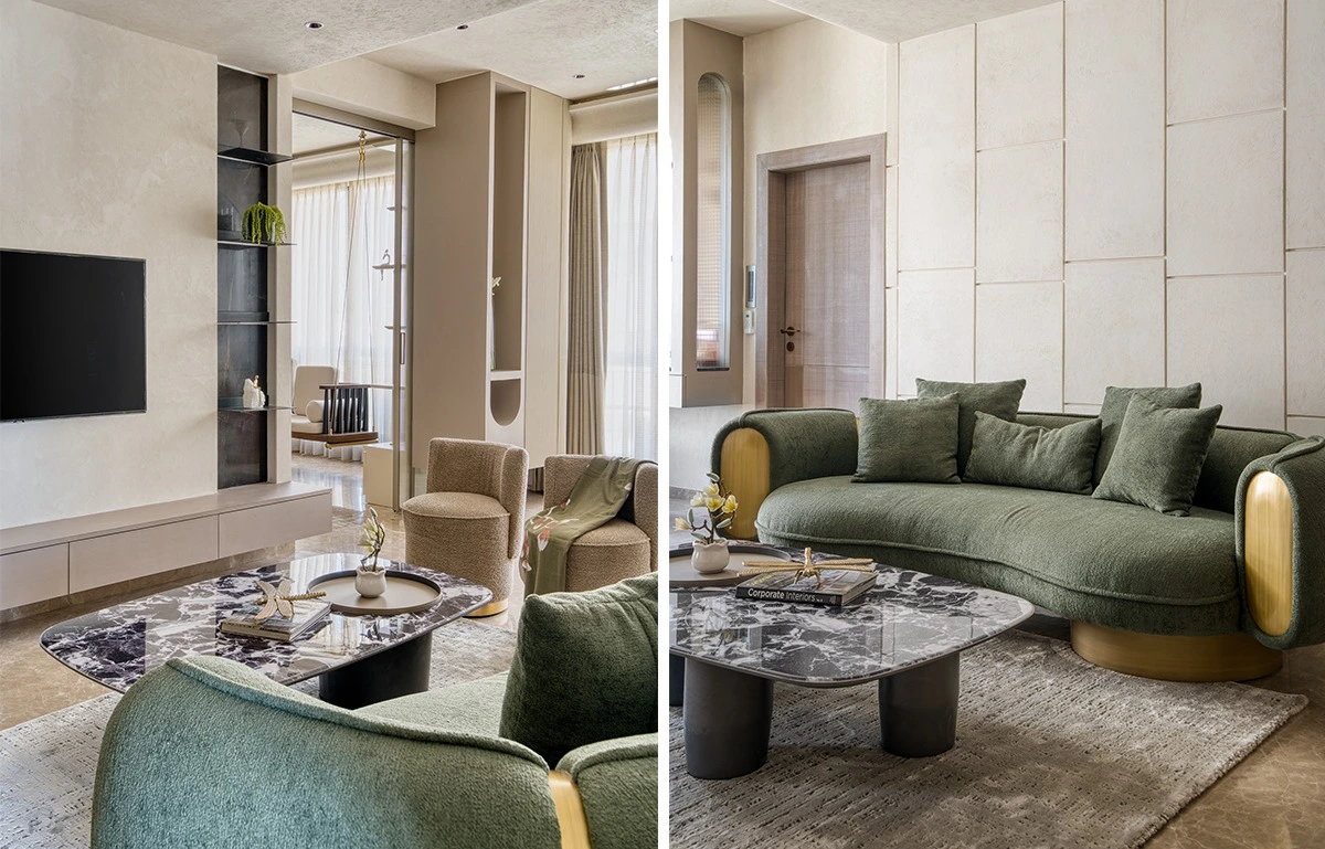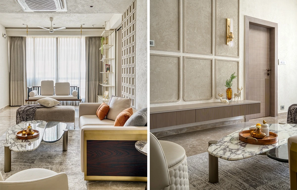 One of the strongest planning moves in this apartment is the separation of formal and informal living zones. While many homes merge all activity into one large room, ID Neha Jaipuria approached the layout with more nuance.