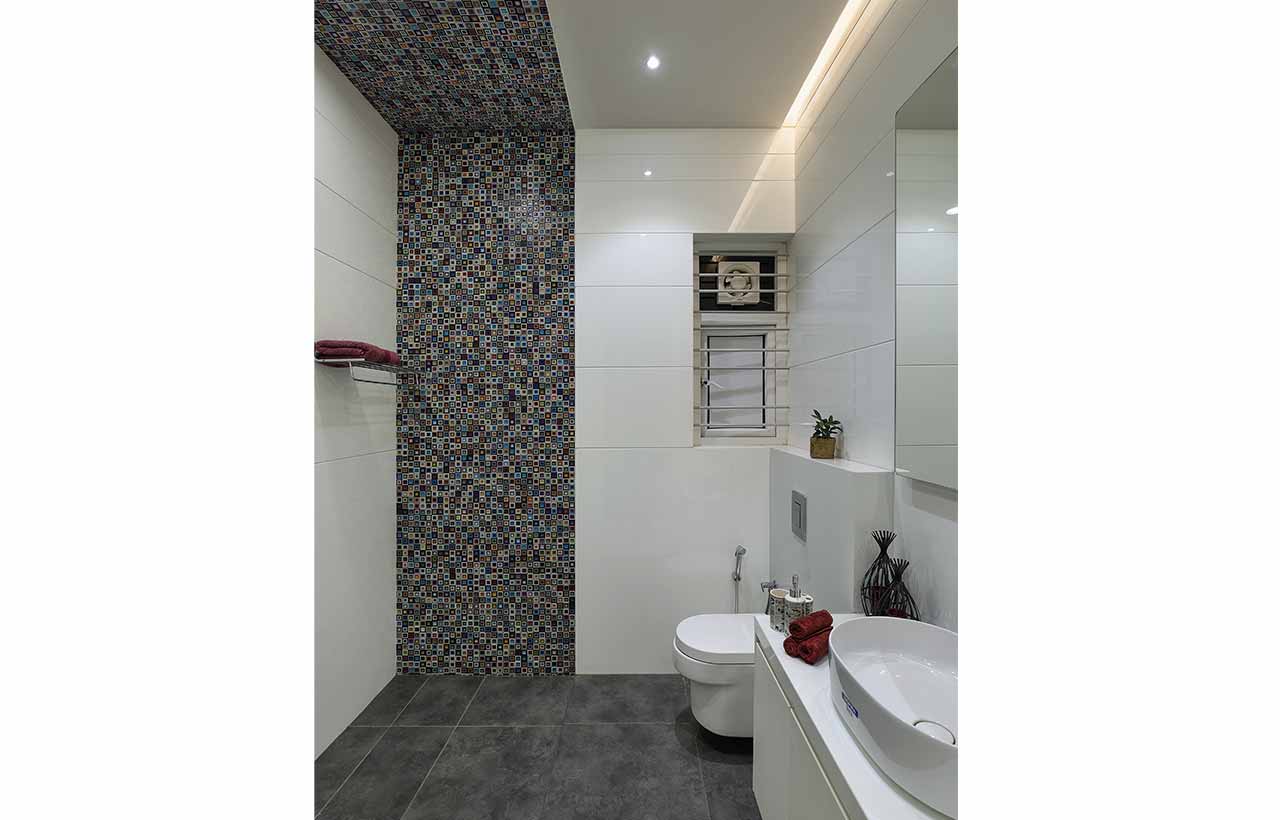 The semi-basement floor was developed as a car parking garage along with a small utility hall, a servant’s toilet, and an elevator from the parking that lead to all the floors making easy accessibility for users. The upper ground floor faces the main road with the common plot across it and is designed as an open floor plan with no partition walls, due to which the whole space feels like one. The main approach of the house is from the main road which is a series of staircases leading up to the porch which is at a height of 8 feet. This accounts for a wholesome experiential journey from the road up to the porch with bamboo planters and flora guiding one all the way. This floor is designed as a living area, dining, and kitchen with a small floating utility, and a guest bedroom/parents’ bedroom. The kitchen backyard was designed as a floating utility. The parents’ washroom being a confined space was entirely cladded in glass, having a white slab complimented by aqua-blue tiles. The balcony attached to the bedroom on the rear side brings out the same language of connectivity with nature.