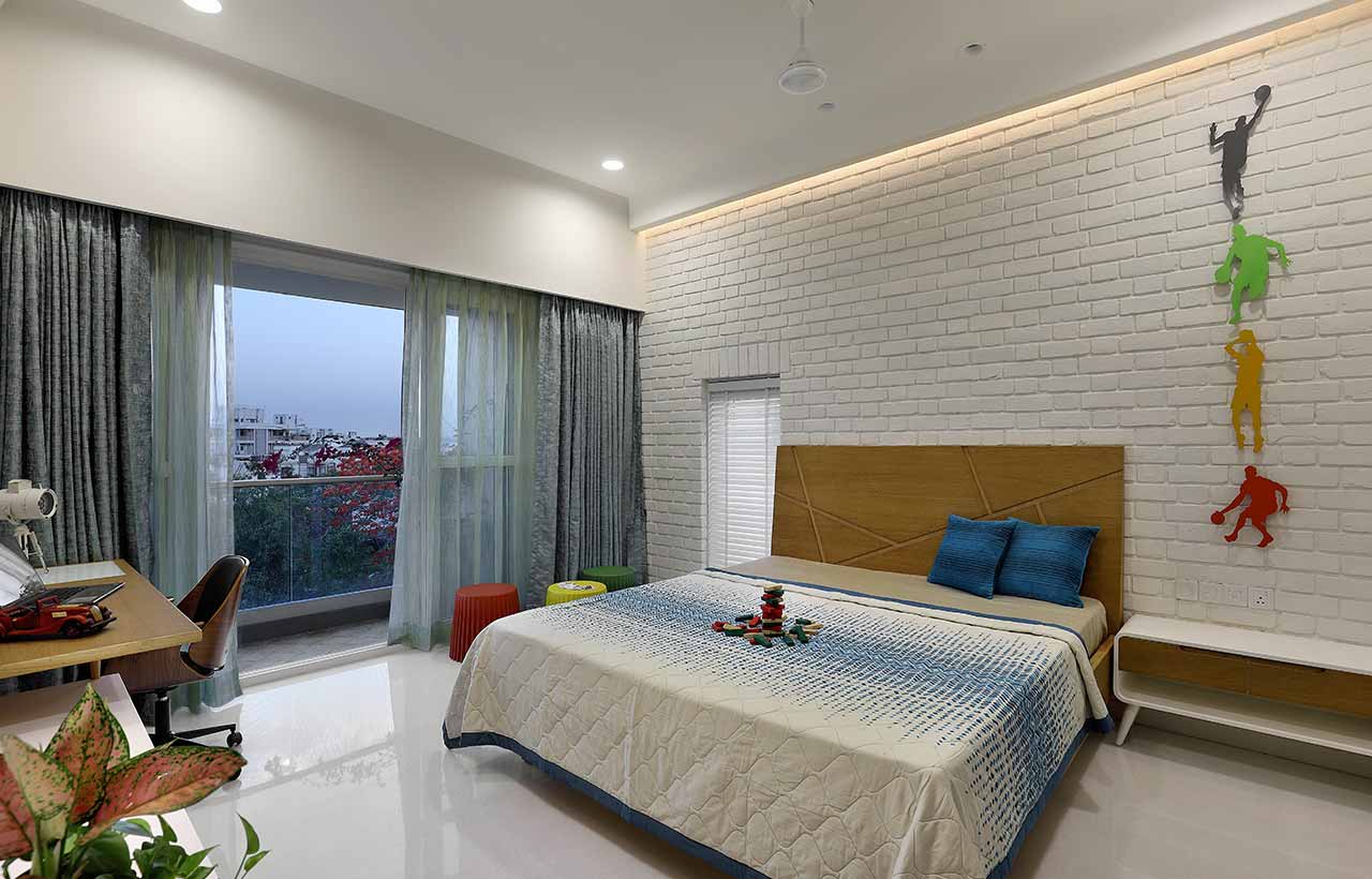 The furniture was made of natural hardwood, bringing the same architectural character to the interiors. The concrete shells were chosen not to be superficially treated, and rather be displayed in their raw, beautiful form. The marble and wooden flooring used in the internal private areas of the residence complemented the basic material palette. Instead of having a typical spiral staircase leading up to the terrace, a fabricated staircase painted bright blue was furnished with the wall behind it being painted in a bright shade of yellow which was inspired by the natural sun rays observed on site that extended to the wall painting. The entire internal staircase was blended with exquisite abstract paintings, adding an interesting character to the space and volume. Since it was a narrow strip of space, the painting brought in more depth and vibrancy. The son’s bedroom was themed on sports and outdoors which were his areas of interest. The brick wall was accentuated with sports decals and artwork. On the other hand, the daughter’s bedroom was designed as more of a free-spirited area with inspirational words and quotes reflecting her liking and taste.