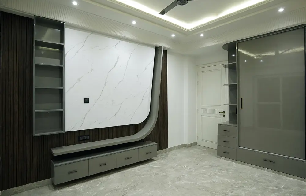 Special attention was given to wardrobe depth, internal partitioning, and electrical placements to ensure practical usability without compromising aesthetics — a mark of expert residential interior designers in Delhi NCR.