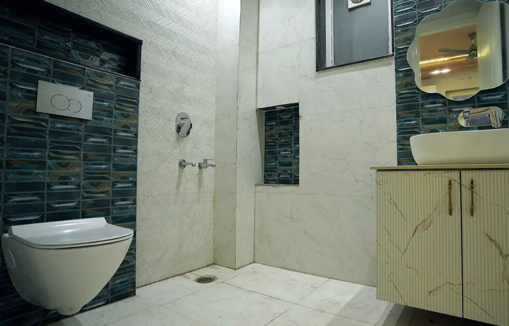 The bathrooms reflect high-end detailing aligned with premium bathroom interior design in Delhi NCR, featuring: