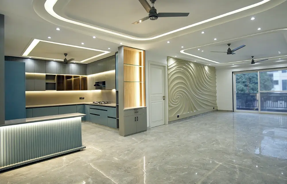 The core design idea revolved around “Modern Luxury with Structural Clarity.” Rather than overloading the space with decorative elements, the focus was on clean geometry, balanced proportions, and statement detailing — a signature style adopted by leading residential interior designers in Delhi NCR.