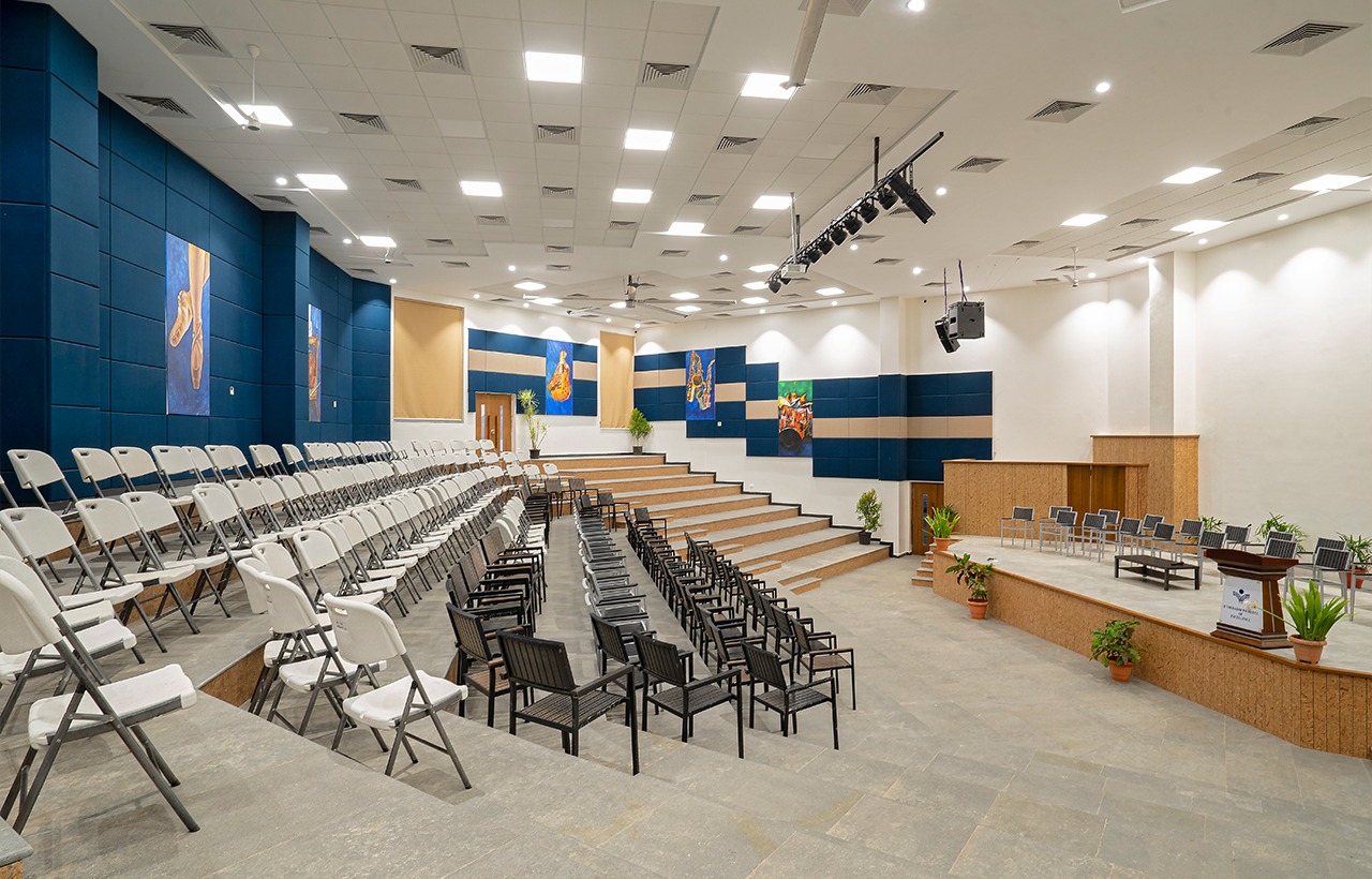 The predominantly concrete structure has been given a reassuring, rich but solid façade by using red sandstone on the exterior. The interiors are theme-based and have been treated to soothing hues by using appropriate age-specific colours. Extensive use of natural-coloured wooden floors and furnishing in common areas like the library has helped in creating a tasteful, comfortable, and welcoming aura in conjunction with warm lighting and fabric upholstery. Impact zones such as dining areas and the auditorium have been incorporated with stone flooring and meaningful wall art to create an environment of sanctuary and at the same time, instill a sense of pride in the institution.