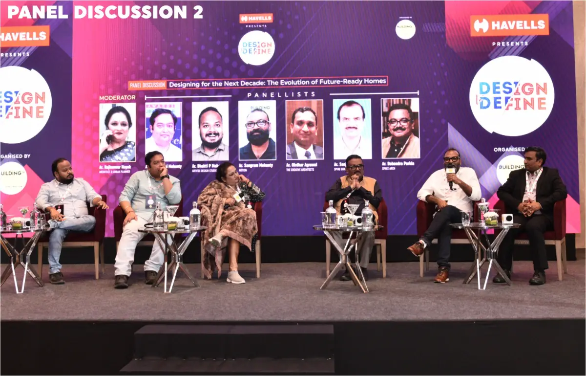The discussion included Ar. Sabyasachi Mohanty, Ar. Bhakti P Mahapatra, Ar. Swopnadutta Mohanty, Ar. Debendra Parida, Ar. Sangram Mohanty, Ar. Girdhar Agrawal and Ar. Sanjeeb Guru. The entire conversation highlighted future-ready design as a blend of smart yet understated technology, flexible and modular spaces, and a strong emphasis on natural light, ventilation, and biophilic elements to support healthier living.